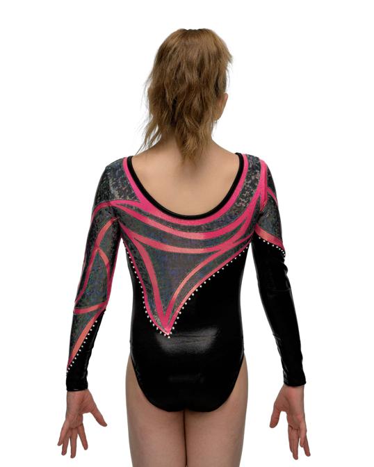 Купальник женский для спортивной гимнастики GK Elite by Dreamlight 5345 черный, серебряный, розовый со стразами с рукавом
