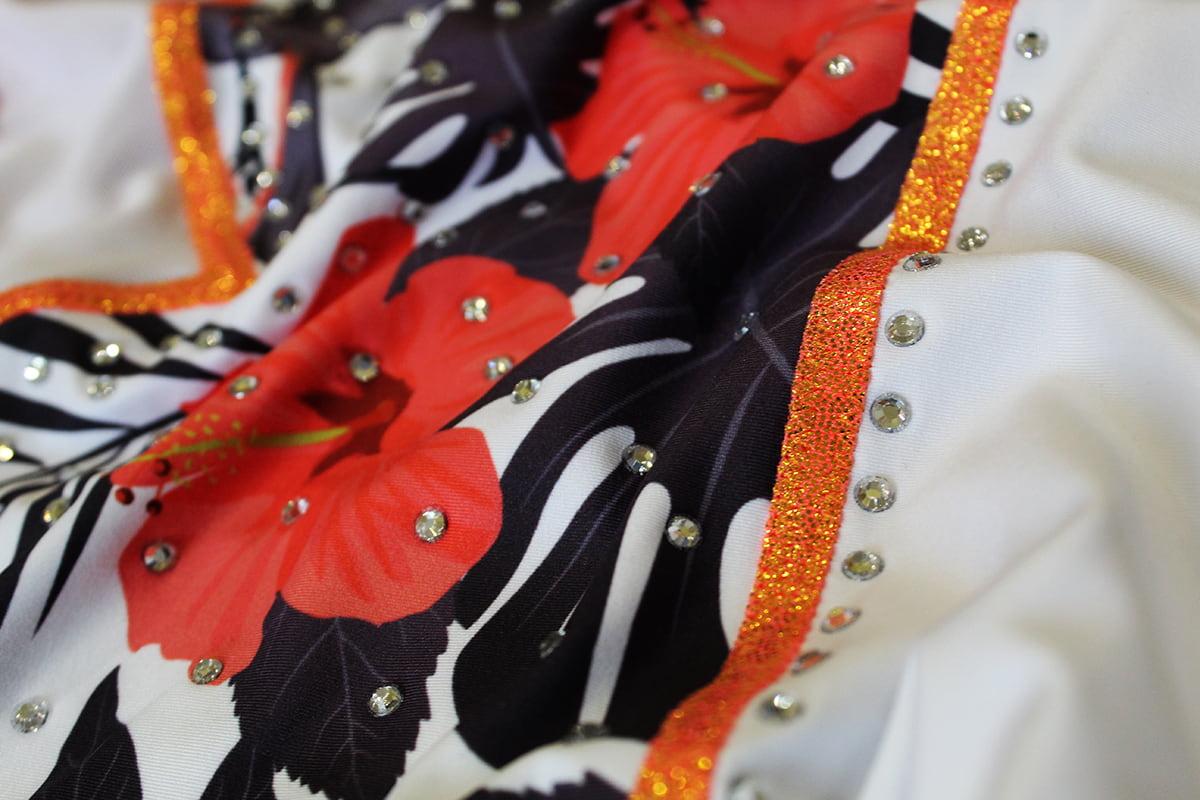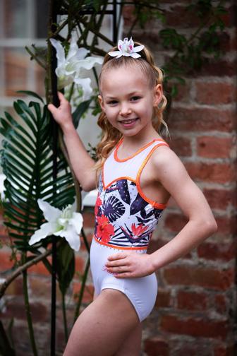 Купальник женский для спортивной гимнастики Darcy Honululu 4238 белый с оранжевым рисунком без рукава