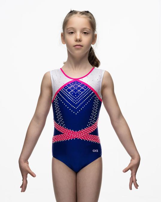 Купальник женский для спортивной гимнастики GK Sport 555-9 темно-синий с белым и розовым со стразами без рукава
