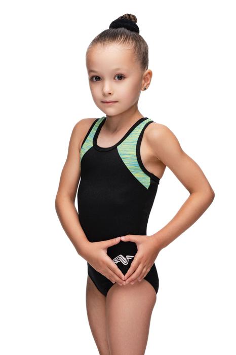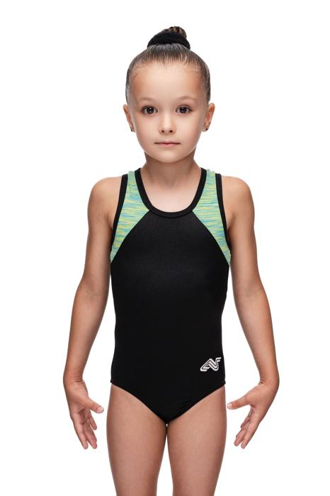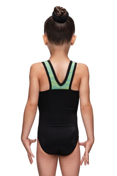 Купальник для спортивной гимнастики Alpha Factor 5413 черный с зелеными вставками на лямках без рукавов