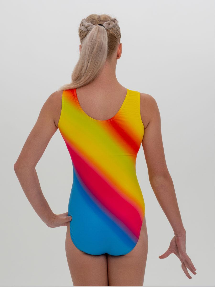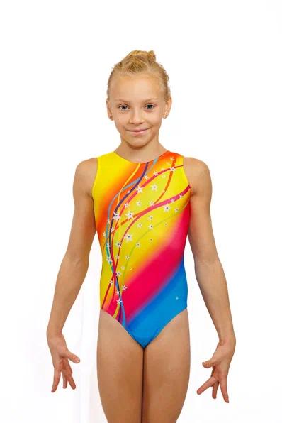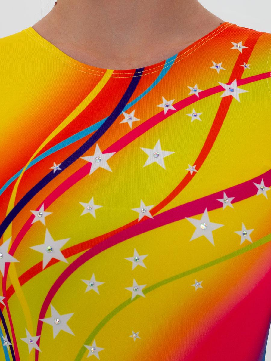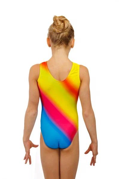 Гимнастический купальник без рукавов для тренировок желто-красно-синий. Для занятий спортивной гимнастикой, акробатикой, прыжками на батуте.