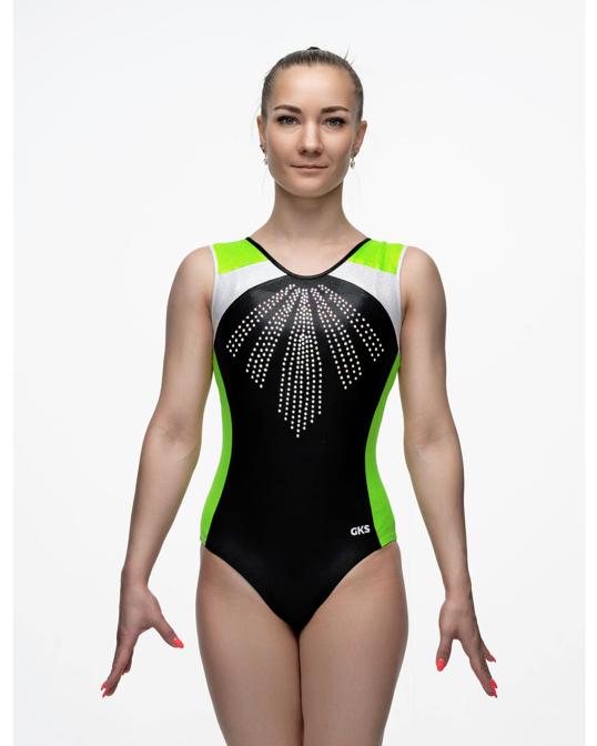 Купальник женский для спортивной гимнастики GK Sport 555-37 черный с белыми и салатовыми вставками без рукава