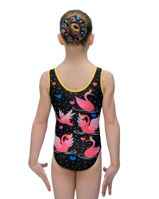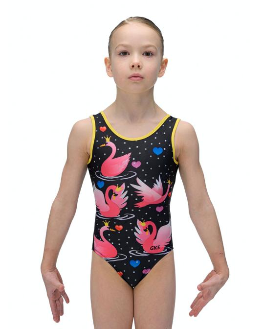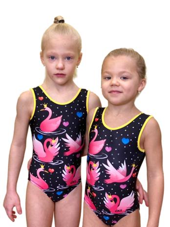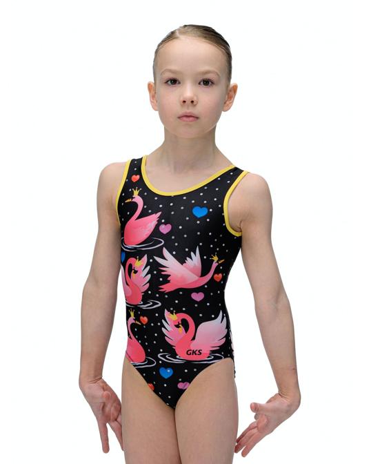 Купальник женский для спортивной гимнастики GK Sport 202-15 черный с розовыми лебедями без рукава