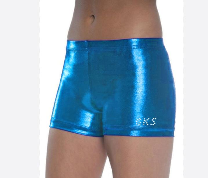 Шорты женские. Шорты идеальны для занятий спортивной гимнастикой, акробатическим рок-н-роллом, фитнесом, прыжкам на батуте и спортивной акробатикой. Стильные шорты изготовленные из металлизированной ткани. Логотип выполнен из страз.