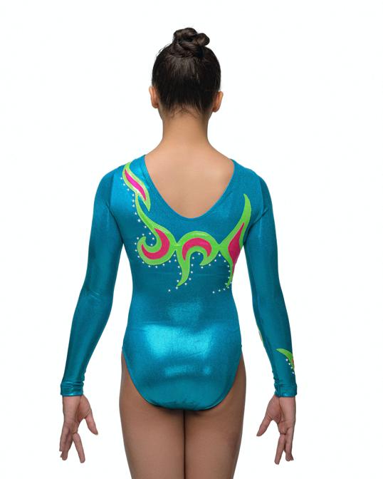 Купальник женский для спортивной гимнастики Alpha Factor 5380 голубой на груди украшен орнаментом салатового и розового цвета со стразами с рукавом