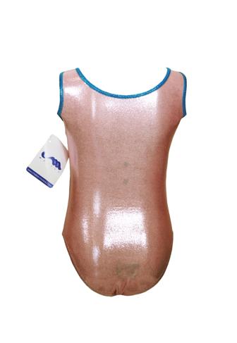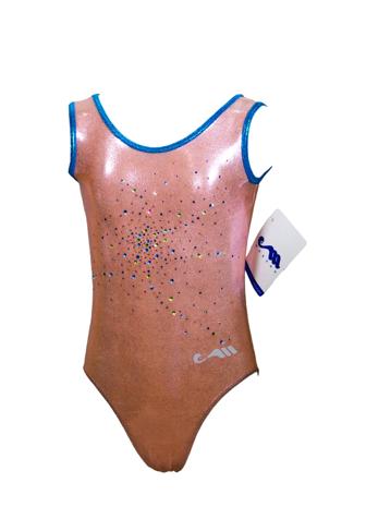 Купальник для спортивной гимнастики Christian Moreau 4282 бледно-розовый со стразами и синей окантовкой на лямках без рукава